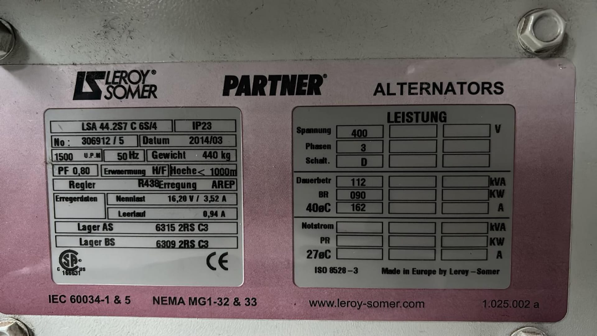 AC-Generator: Leroy Somer LSA 44.2 S7/4P, 112 KVA