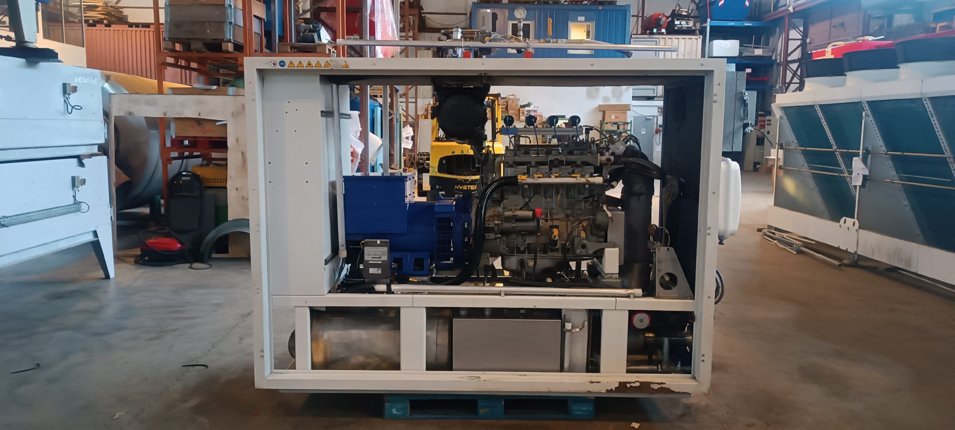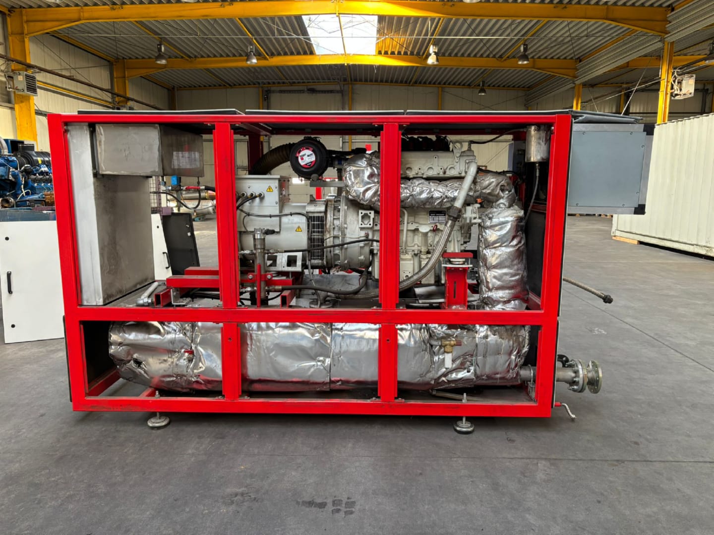 Dieselaggregat von 2014 mit unbekannten Betriebsstunden, ohne Steuerung. Flutschaden auf 72 cm Höhe. 149 KWel x 1.800 U/min, 440 V/60 Hz. Preis: auf Anfrage