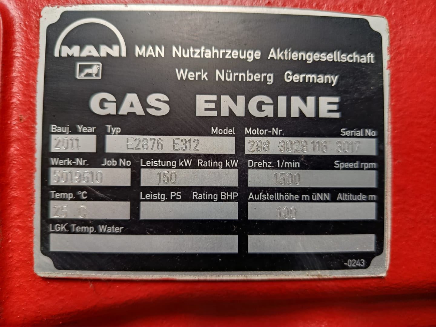 140 KWel x 1.500 U/min, 400 V / 50 Hz.