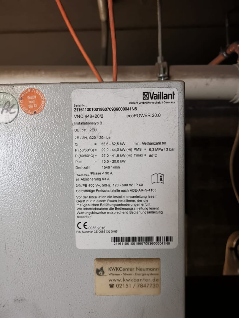 Gas Strom- und Wärmeerzeuger, unbekanntes Baujahr und Betriebsstunden.