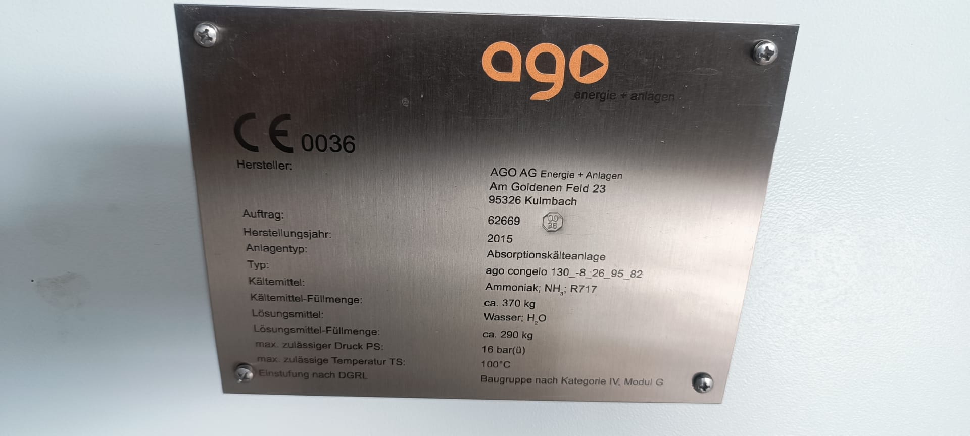 Refrigerant: Ammonia, 370 kg