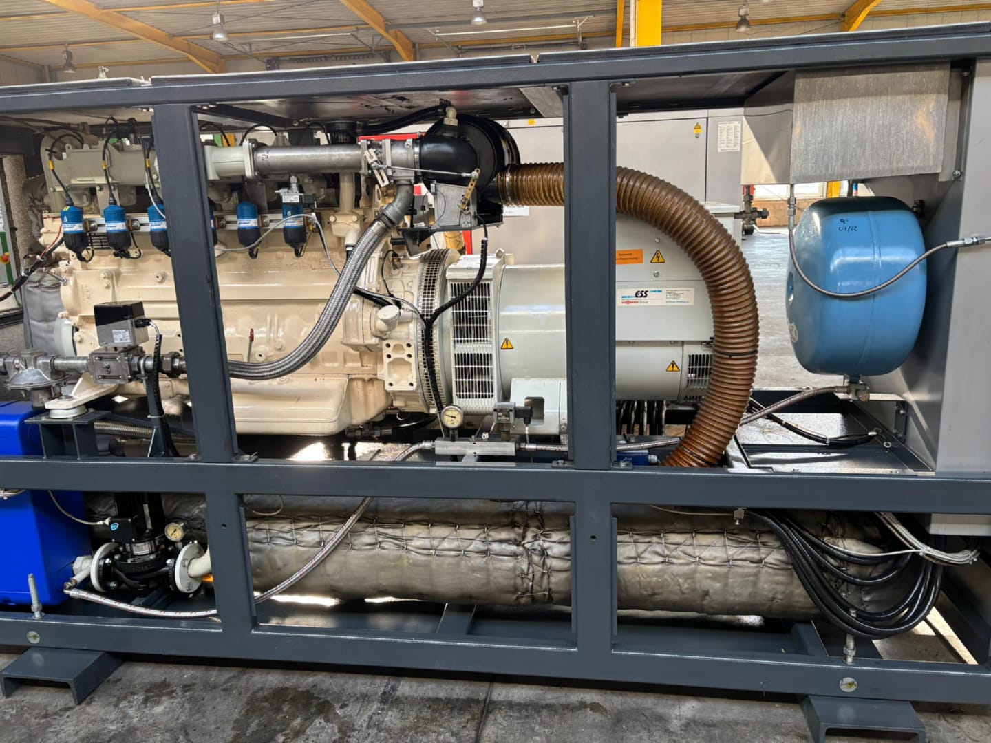 Gas generator from 2004, scope of delivery: base frame and generator, as shown with missing parts – sockets defective. 1 available. 1.400 KW / 1.800 KVA, 1.365 KWel x 1.500 U/min, 400 V/50 Hz. Price: €17,900